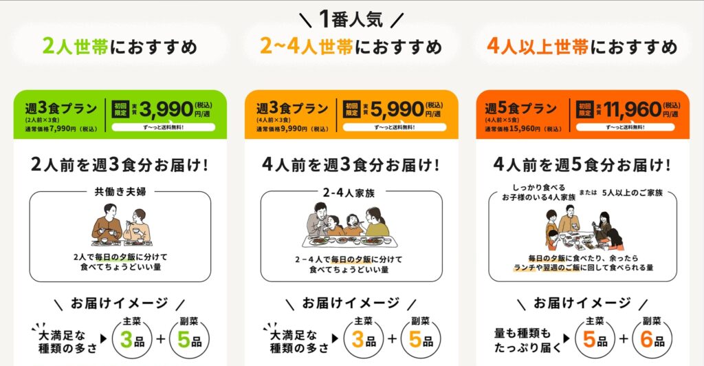 両者を同じ条件で安さを比べるとしたら、4人前×3食分である「食卓おまかせプラン」と「週3食プラン」で比較することになります。