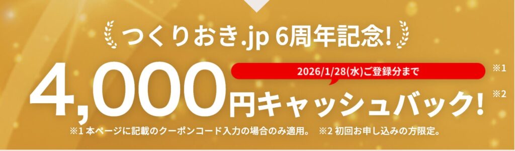 つくりおきjpは2026年で6周年を迎えたそうで、4,000円分のキャッシュバックキャンペーンを実施中です!